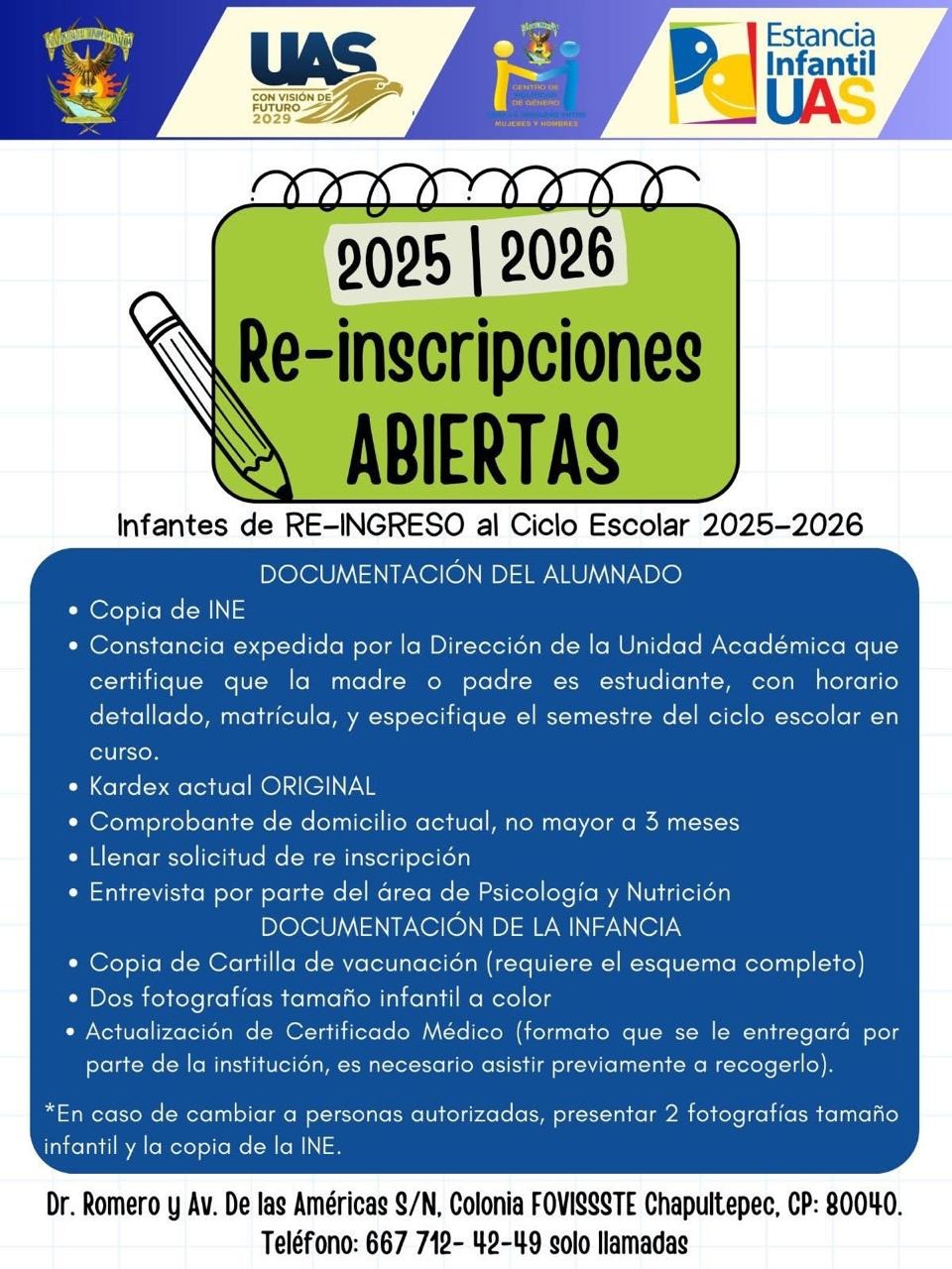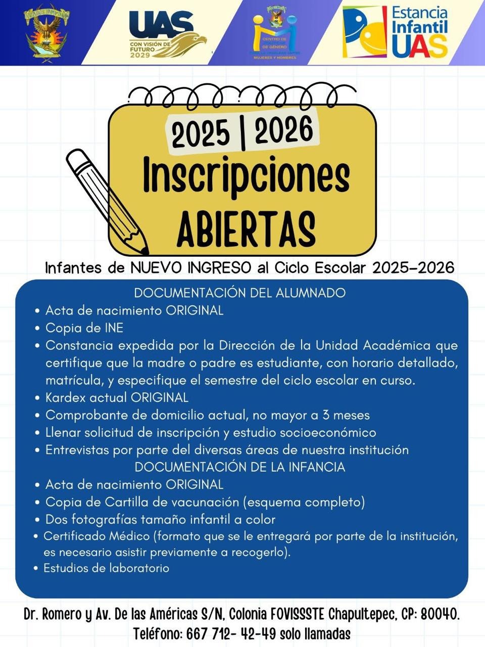 Culiacán, Sinaloa.- La Estancia Infantil de la Universidad Autónoma Sinaloa, UAS, invita a madres y/o padres de familia, con hijos entre los 12 a 48 meses de edad, que estudian en cualquiera de los niveles de enseñanza, y que necesitan del cuidado de ellos mientras estudian, a que se acerquen a este espacio para realizar el proceso de inscripción y reinscripción, informó Ariadna Angulo García.
