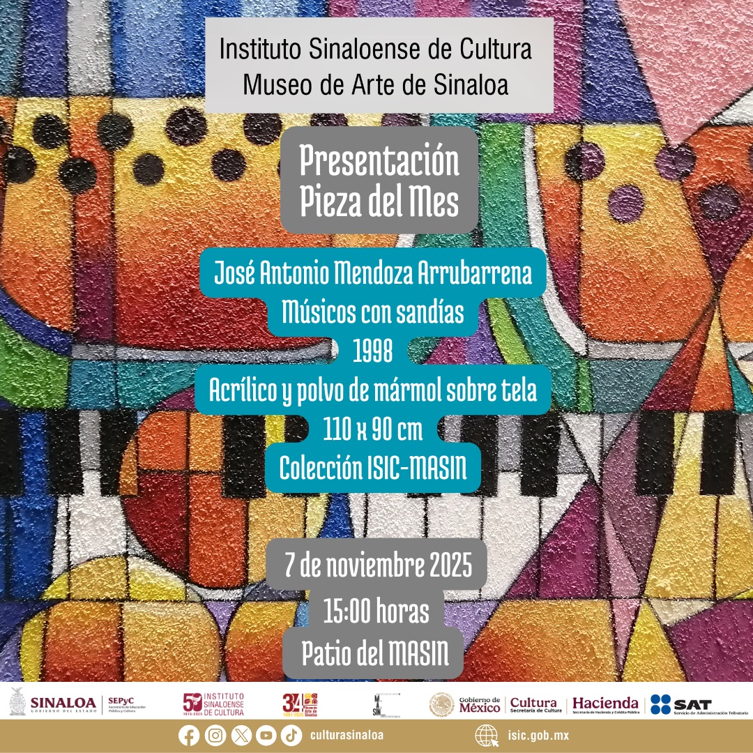 Las actividades para este mes, que incluyen la magna exposición fotográfica “El México de los mexicanos III”, en colaboración con Fomento Cultural Banamex (programada para el 21de noviembre), inician este viernes 7 a las 15:00 horas con la Presentación de la Pieza del Mes, con la obra “Músicos con sandías” (acrílico y polvo de mármol sobre tela, 110 x 90 cm, 1998, Colección ISIC-MASIN), del pintor mexicano José Antonio Mendoza Arrubarrena.
