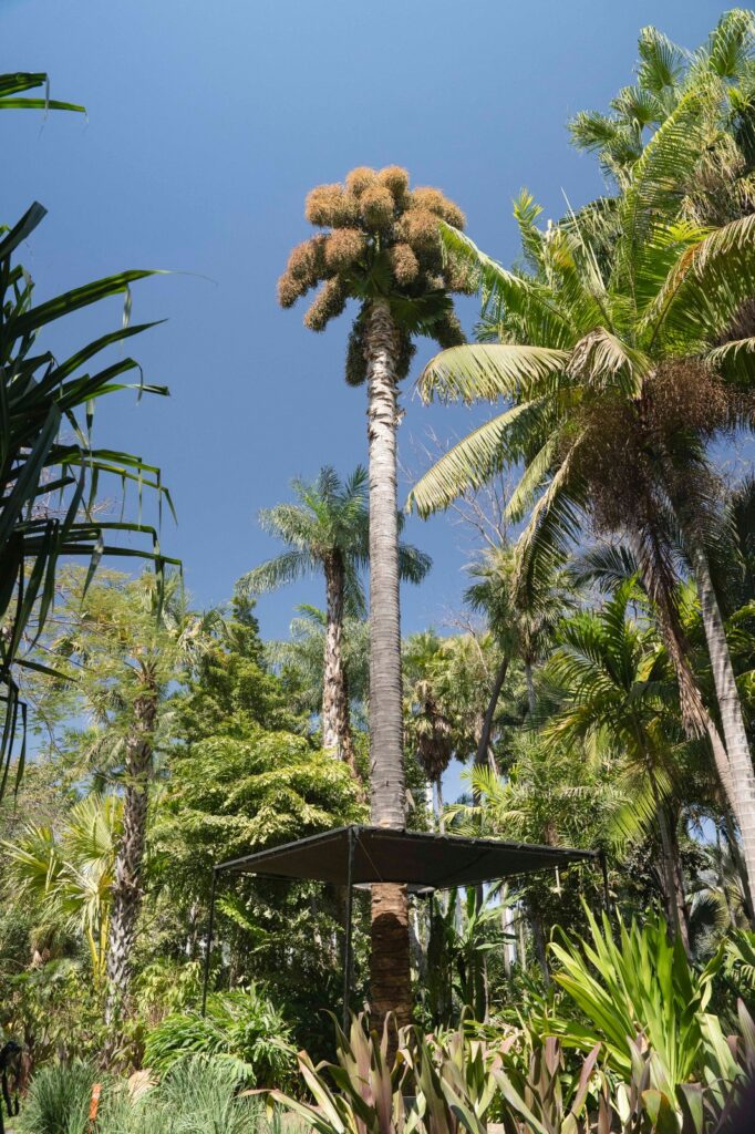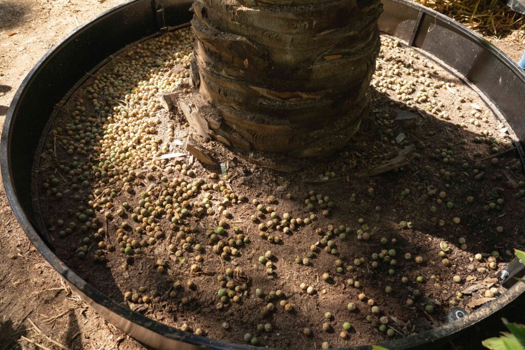 Actualmente, colaboradores especializados del Jardín Botánico Culiacán realizan la recolección de los frutos de la Talipot, para lo cual se elaboró una estructura tipo velaría que se instaló debajo de la planta, pues debido a su gran altura es complicado realizar estos procedimientos.
