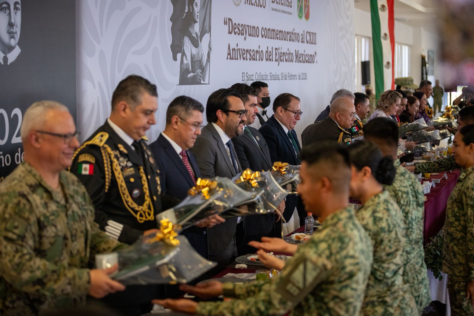 Culiacán, Sinaloa.- En un acto de reconocimiento a la vocación de servicio hacia la población del país, el alcalde Juan de Dios Gámez Mendívil acudió, en compañía del gobernador Rubén Rocha y de autoridades legislativas y judiciales, a la conmemoración del 113 aniversario del Ejército Mexicano.