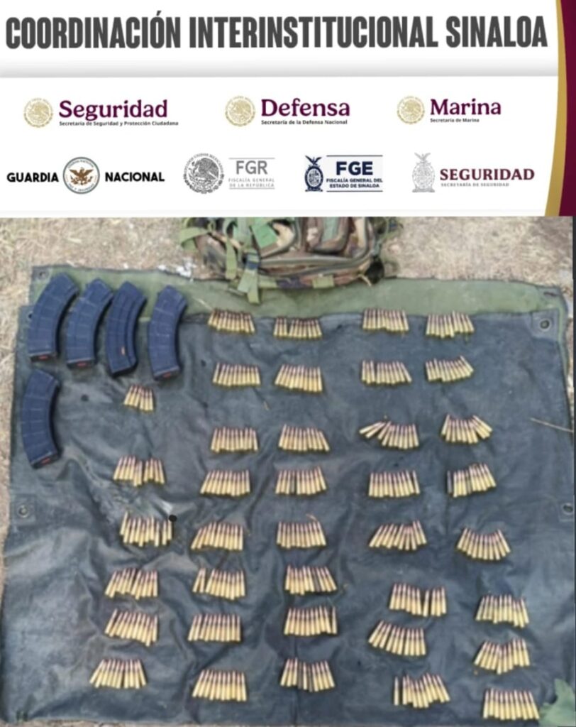 Elementos del Ejército Mexicano, en coordinación con la Guardia Nacional, la Secretaría de Marina, la Secretaría de Seguridad y Protección Ciudadana, la Fiscalía General de la República, la Fiscalía General del Estado y la Secretaría de Seguridad Pública del Estado, a través de la Policía Estatal Preventiva, aseguraron cargadores y cartuchos en el municipio de Culiacán.