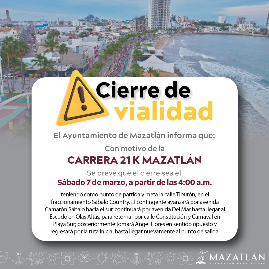 Mazatlán, Sinaloa.— La Secretaría de Seguridad Pública Municipal, a través de la Unidad de Vialidad, informó que, con motivo de la carrera pedestre de 21 kilómetros, diversas vialidades de la zona turística de Mazatlán tendrán cierres parciales la mañana del sábado 7 de marzo.