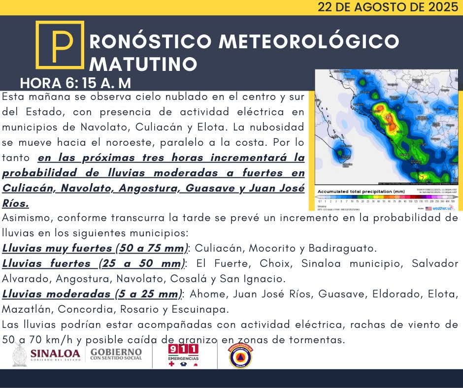 El Coordinador Municipal de Protección Civil, Óscar Roberto Osuna Tirado, informó que para Mazatlán se esperan lluvias moderadas, con acumulados de 5 a 25 milímetros, por lo que se exhorta a la ciudadanía conduzca con precaución, a fin de evitar algún tipo de percance.