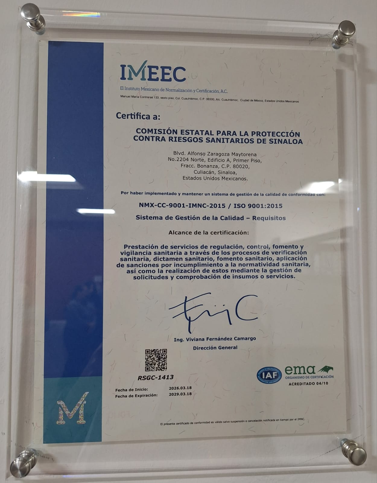 “La certificación conforme a la Norma ISO 9001:2015 refleja el compromiso institucional con la calidad, la transparencia y la mejora continua de nuestros servicios, consolida procesos más eficientes y confiables, alineados con los estándares internacionales de calidad; como institución responsable de proteger a la salud contra riesgos sanitarios, esta certificación refleja nuestro cumplimiento de la normatividad sanitaria vigente”.