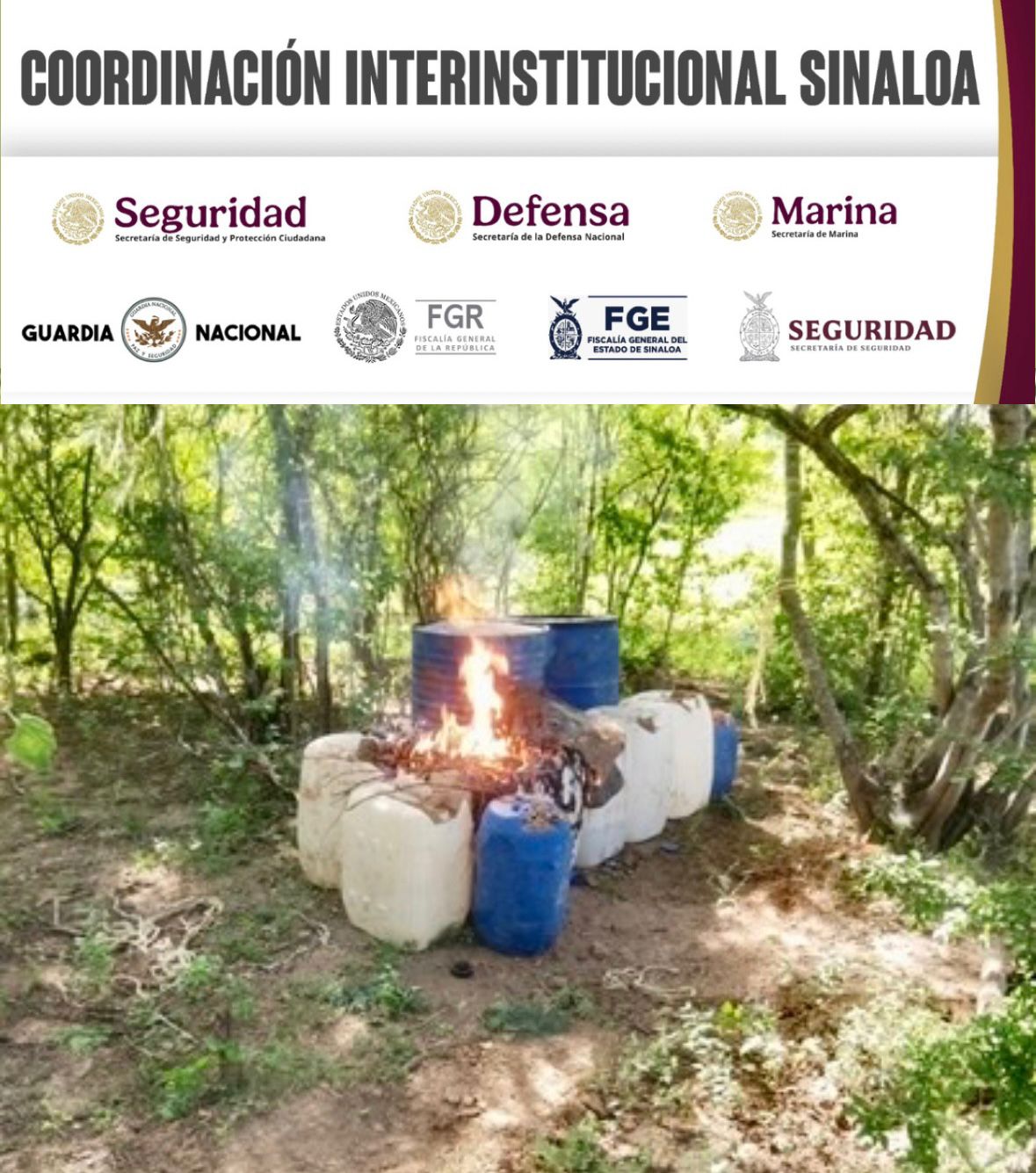Culiacán, Sinaloa | Personal del Ejército Mexicano, en coordinación con la Guardia Nacional, la Secretaría de Marina, la Secretaría de Seguridad y Protección Ciudadana, la Fiscalía General de la República, la Fiscalía General del Estado y la Secretaría de Seguridad Pública de Sinaloa, a través de la Policía Estatal Preventiva, aseguraron y destruyeron áreas de almacenamiento de precursores químicos en Culiacán.