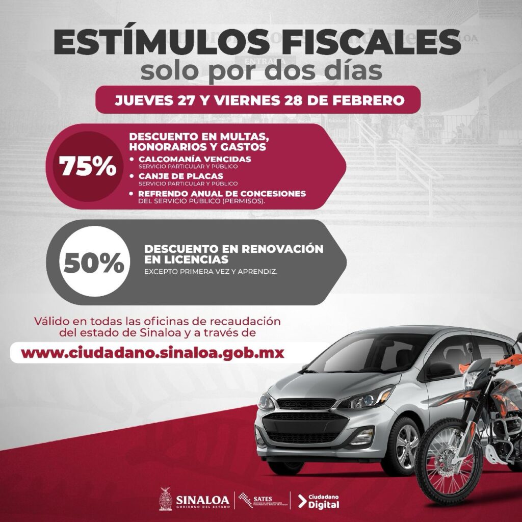 Culiacán, Sinaloa.- El Servicio de Administración Tributaria del Estado de Sinaloa (SATES) informa a la ciudadanía que los días 27 y 28 de febrero se otorgarán estímulos fiscales en trámites vehiculares y placas en todas las oficinas de recaudación, módulos y colecturías del estado; se contará con un horario de atención de 8:00am a 3:00pm.
