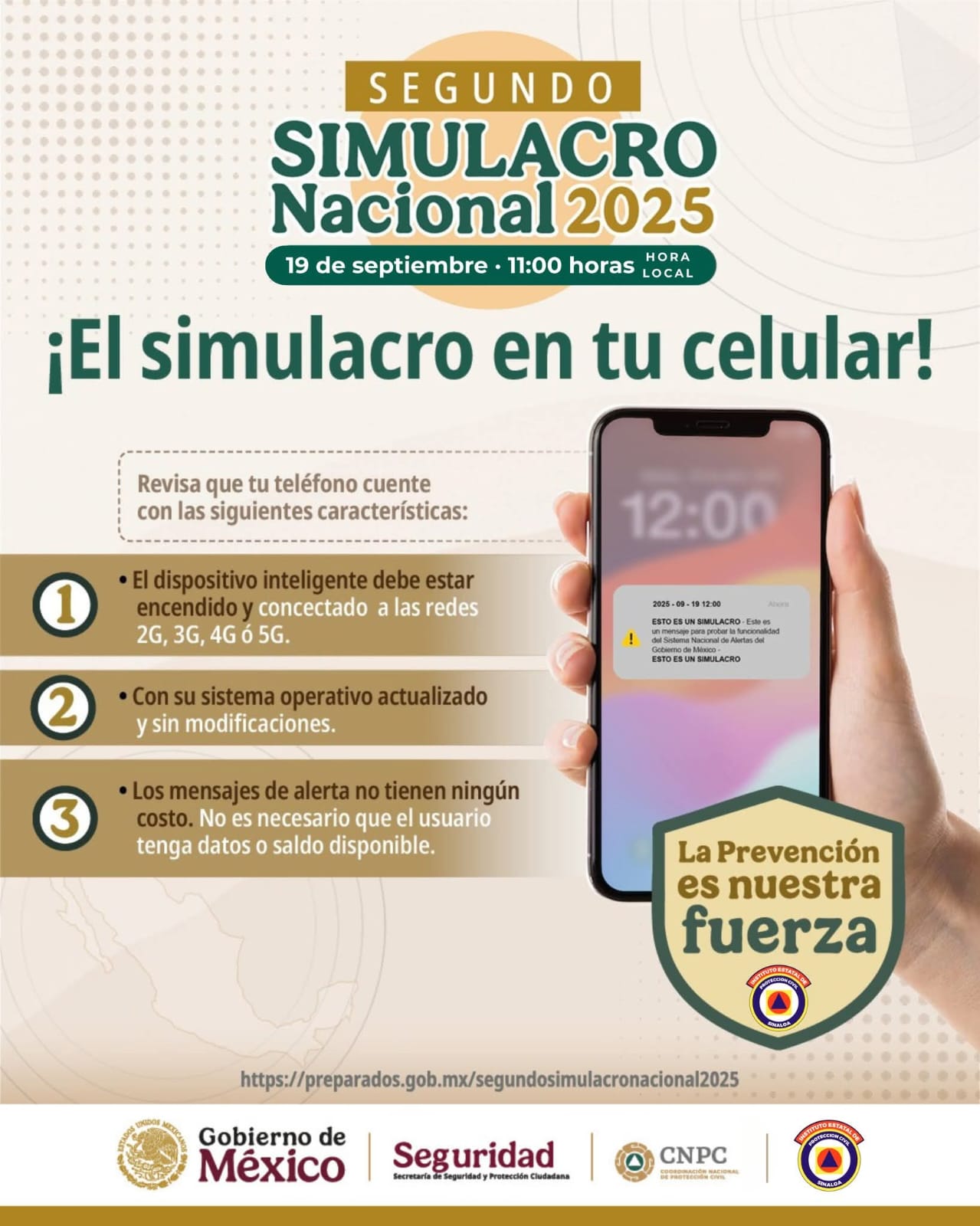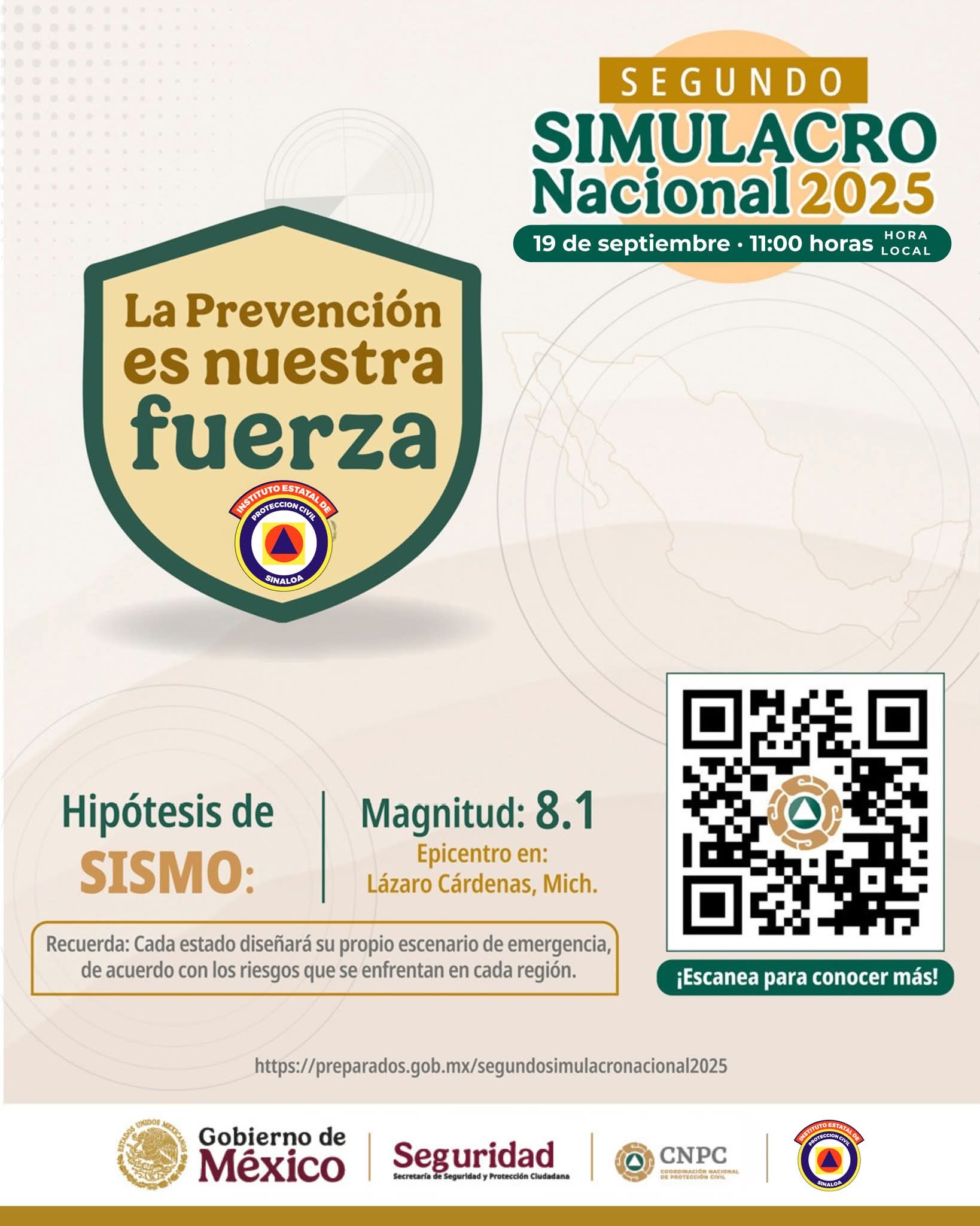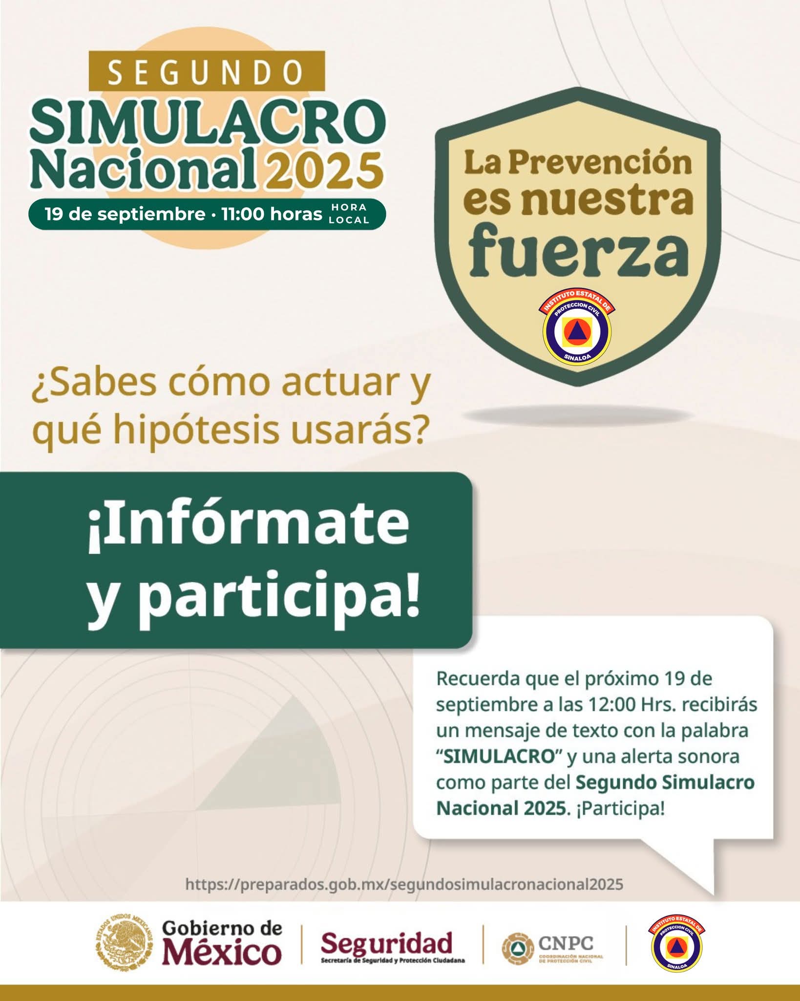 “Viene el Simulacro Nacional, un gran ejercicio donde las instituciones, las empresas, las familias, tenemos la oportunidad de participar, hacer una cultura de prevención, hacer una cultura de Protección Civil, este 19 de septiembre va a ser el Simulacro Nacional a las 11:00 de la mañana, hora de Sinaloa, va a ser una hipótesis de sismo categoría 8.1, y los invitamos a que registren sus instituciones, sus negocios, sus familias, en preparados.gob.mx”.