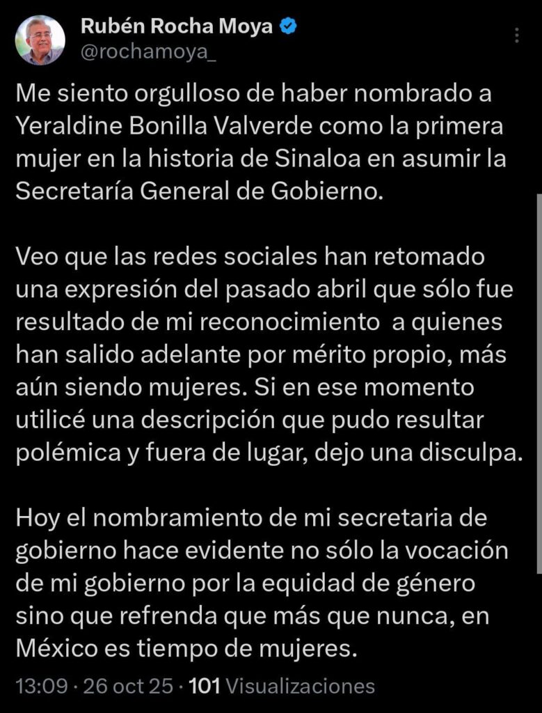Rocha Moya también aprovechó el mensaje para ofrecer una disculpa por una expresión utilizada en abril pasado, que fue retomada en redes sociales tras el nombramiento. Señaló que su intención fue reconocer el mérito de quienes han salido adelante por esfuerzo propio, especialmente mujeres, y lamentó si sus palabras resultaron fuera de lugar.