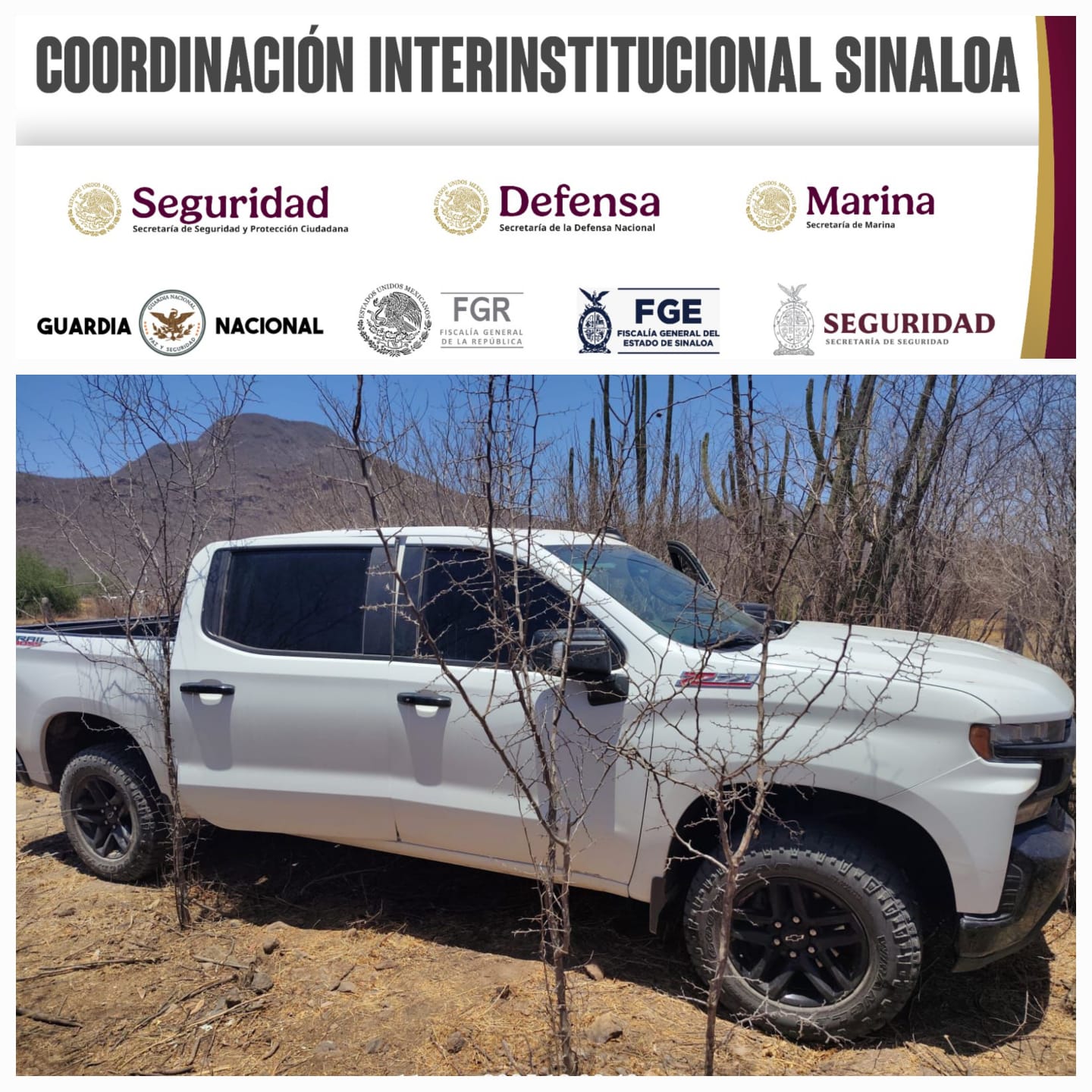 En acciones de reconocimiento terrestre, el personal naval que circulaba por diferentes poblados del municipio, como Dautillos y Juan Aldama, ubicó dos vehículos: una camioneta blanca pickup de la marca Cheyenne y una camioneta de color rojo tinto marca Toyota.