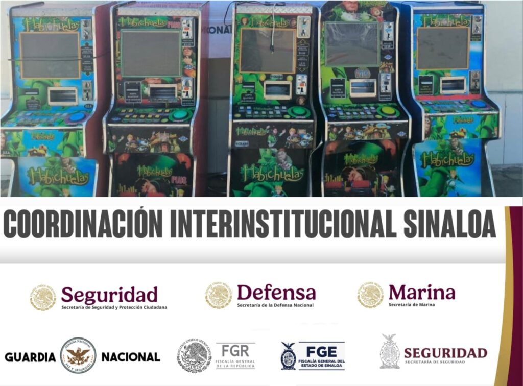 La Secretaría de Marina Armada de México, en coordinación con el Ejército Mexicano, la Guardia Nacional, la Fiscalía General de la República, la Fiscalía General del Estado y la Secretaría de Seguridad Pública del Estado, aseguró máquinas tragamonedas en distintos hechos en los municipios de Badiraguato, Mazatlán y El Rosario.