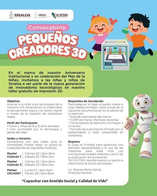 Culiacán, Sinaloa | En el marco de su 34 aniversario y como parte de la celebración del Mes de la Niñez, el Instituto de Capacitación para el Trabajo del Estado de Sinaloa, ICATSIN, lanzó la convocatoria “Pequeños Creadores 3D”, un taller gratuito dirigido a niñas y niños de Culiacán interesados en la innovación y la tecnología, compartió la directora Brenda García Félix.
