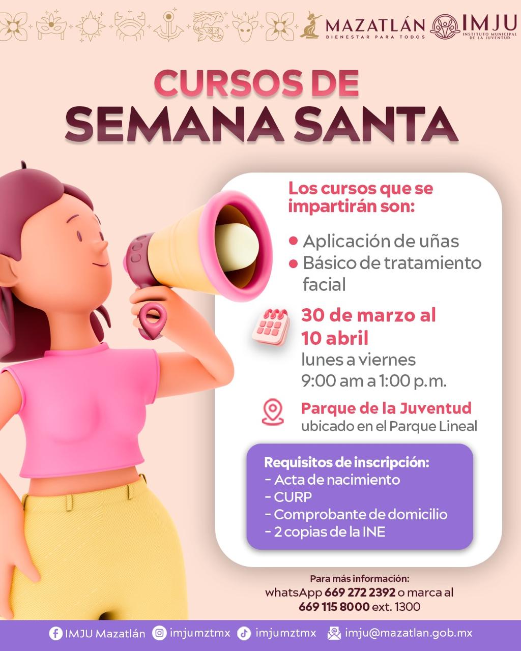Mazatlán, Sinaloa.– El Gobierno de Mazatlán, por medio del Instituto Municipal de la Juventud (IMJU), anunció la realización del programa Cursos de Semana Santa “Aplicación de Uñas” y “Básico de Tratamiento Facial”, que se llevará a cabo del 30 de marzo al 10 de abril, de lunes a viernes, de 09:00 a 13:00 horas, en el Parque de la Juventud, ubicado en el Parque Lineal.