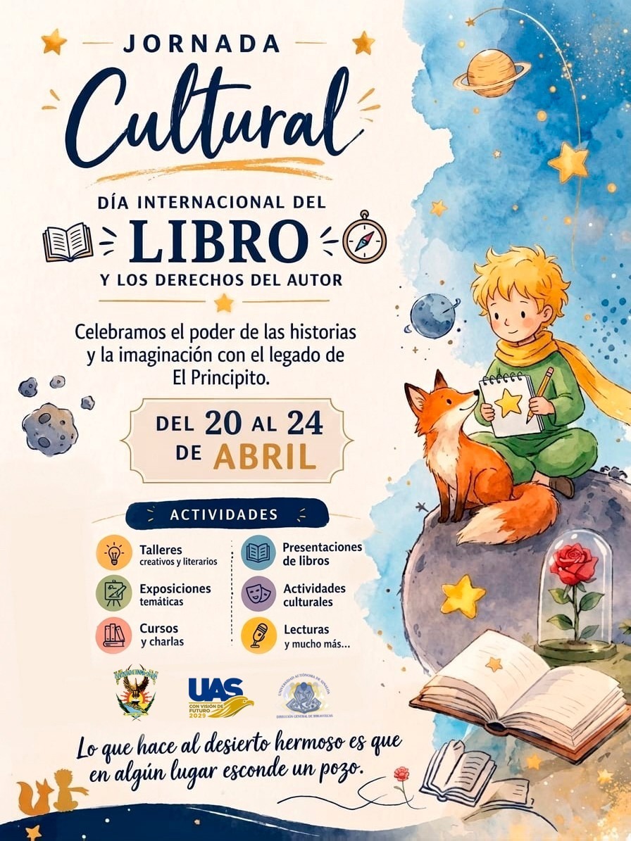 Culiacán, Sinaloa. – Con una amplia agenda cultural y el propósito de reconectar a la sociedad con la lectura como una experiencia humana, la Universidad Autónoma de Sinaloa, UAS, llevará a cabo la Jornada Cultural por el Día Internacional del Libro y los Derechos de Autor 2026, a partir de este lunes 20 y hasta el 24 de abril en todo el estado.