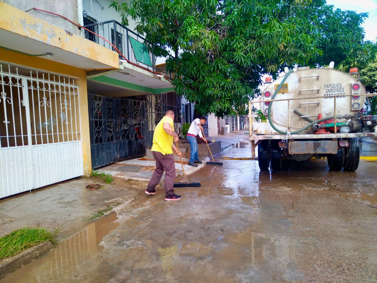 Las acuadrillas se apoyan con maquinaria para agilizar las acciones de limpieza en las calles de Jacarandas, donde se realiza lavado y retiro de lodo.