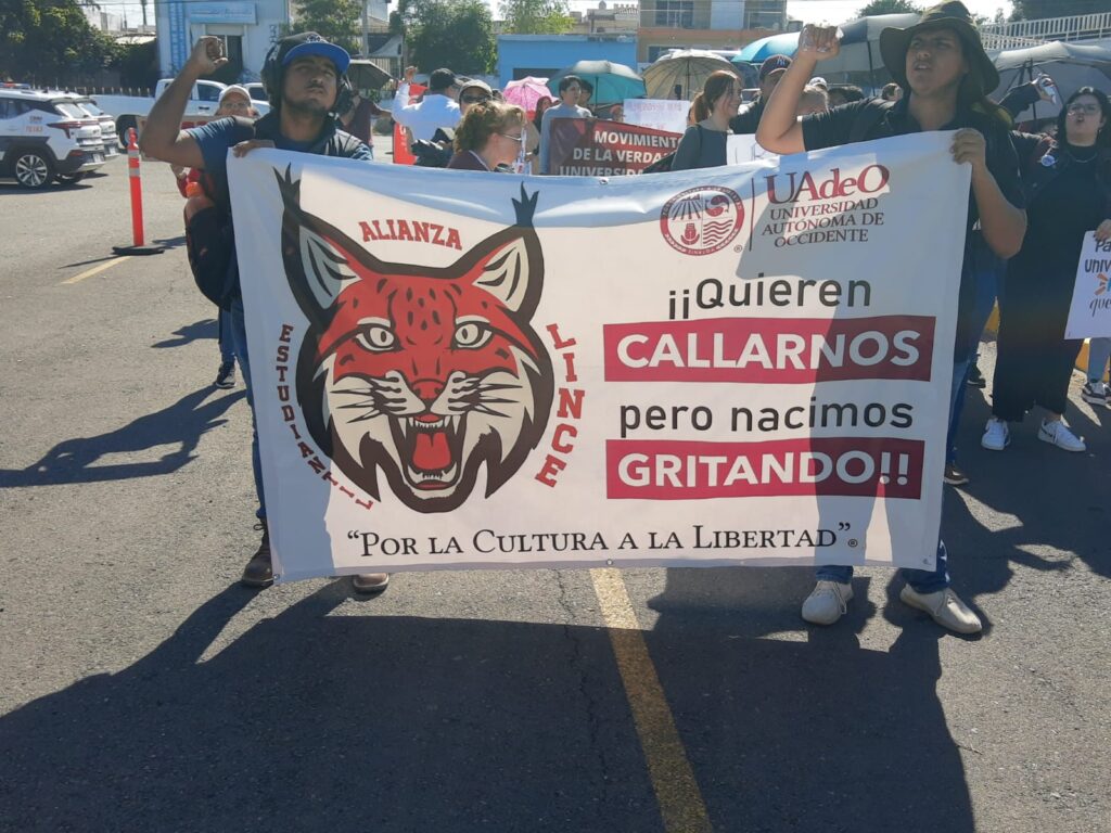 Culiacán, Sinaloa.- Integrantes del Movimiento para la Defensa de la Verdadera Autonomía de la Universidad Autónoma de Occidente convocaron a una marcha hacia el Congreso del Estado de Sinaloa, tras denunciar el pasado miércoles el despido de tres auxiliares administrativos de la Extensión Escuinapa, quienes eran participantes activos de esta causa.