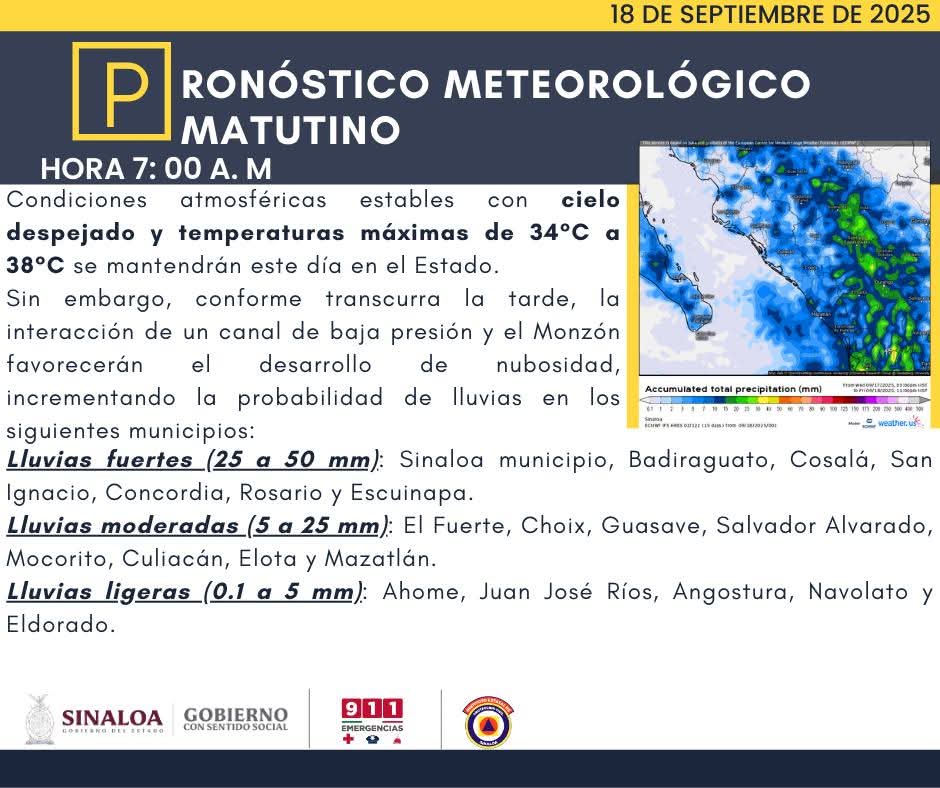 Mazatlán, Sinaloa.- Las condiciones climáticas pronosticadas para el día jueves serán estables, con cielo despejado y temperaturas máximas de 34 °C a 38°C; sin embargo, conforme transcurra la tarde, incrementará la probabilidad de lluvias, informó la Coordinación Municipal de Protección Civil.