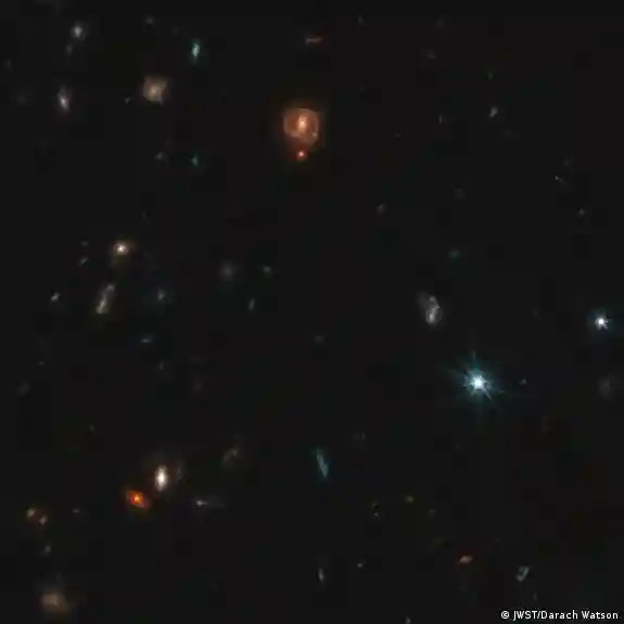 Los pequeños puntos rojos no serían galaxias con muchas estrellas, sino agujeros negros absorbiendo gases.Imagen: JWST/Darach Watson