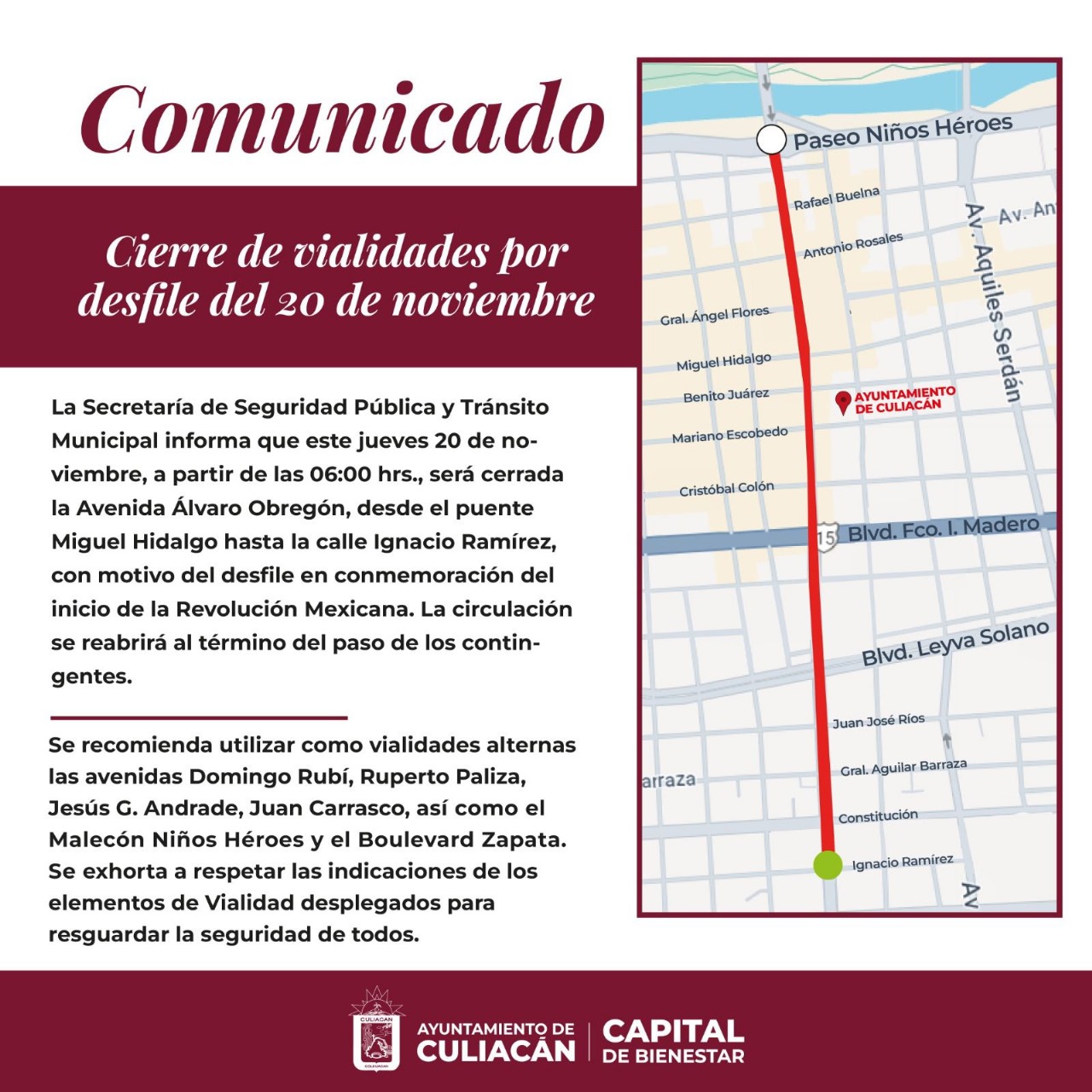 Culiacán, Sinaloa.- Para garantizar la seguridad de asistentes y participantes, así como mantener el orden durante el desarrollo del desfile con motivo del 115 Aniversario de la Revolución Mexicana, la Secretaría de Seguridad Pública y Tránsito Municipal informa a la ciudadanía que este jueves 20 de noviembre se aplicarán cierres y desvíos viales en el primer cuadro de la ciudad.