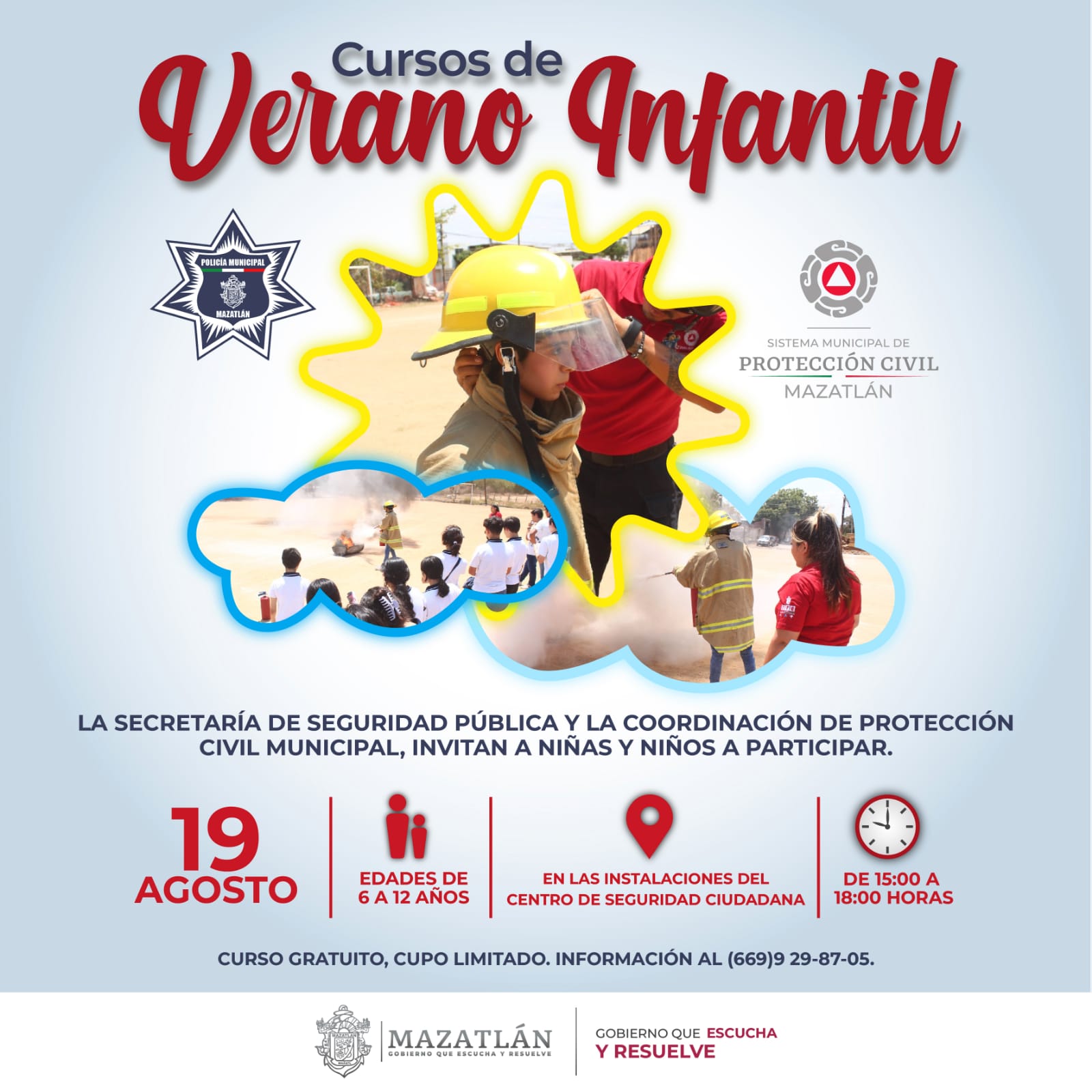 Mazatlán, Sinaloa | La Secretaría de Seguridad Pública y Tránsito Municipal y la Coordinación de Protección Civil de Mazatlán invitan a los padres de familia a un curso taller dirigido a niños de entre 6 y 12 años de edad en los que recibirán capacitación en técnicas de atención ante situaciones riesgo dentro y fuera del hogar.