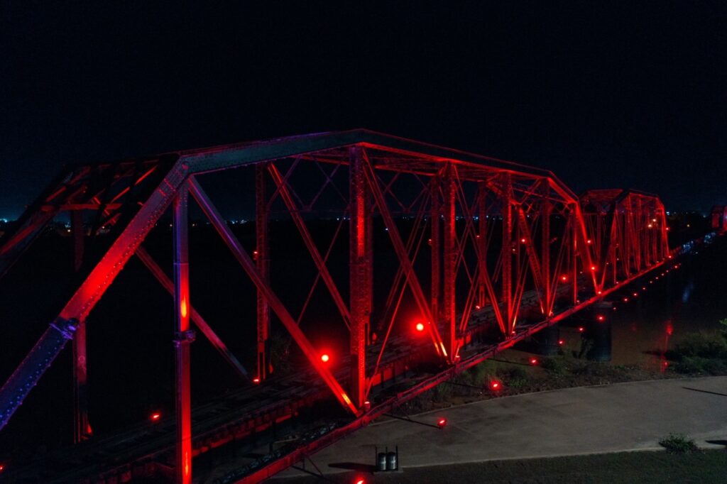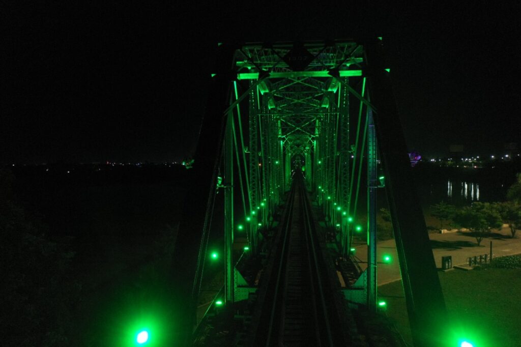 El cambio de la iluminación de esta infraestructura ubicada sobre el Río Culiacán, por encima del Parque Acuático, está a cargo de la Dirección de Turismo Municipal, quien en coordinación con la Dirección de Alumbrado Público y Eficiencia Energética, embellece el entorno urbano de la capital.