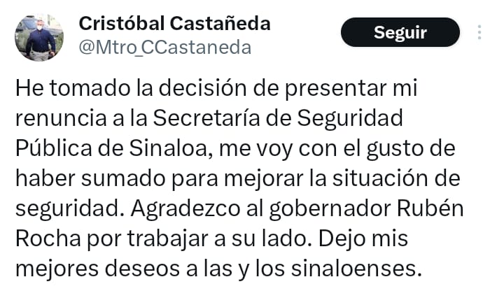 “He tomado la decisión de presentar mi renuncia a la Secretaría de Seguridad Pública de Sinaloa, me voy con el gusto de haber sumado para mejorar la situación de seguridad. Agradezco al gobernador Rubén Rocha por trabajar a su lado. Dejo mis mejores deseos a las y los sinaloenses”, posteó el teniente coronel Castañeda Camarillo.