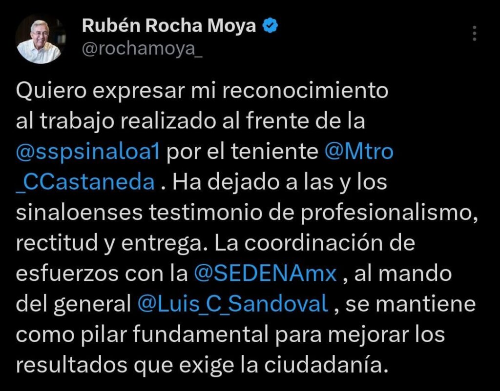 Minutos más tarde a la confirmación del exsecretario, se sumó el mensaje del gobernador del estado, Rubén Rocha Moya, quien también desde sus redes sociales reconoció el trabajo de Castañeda Camarillo por su “profesionalismo, rectitud y entrega”.