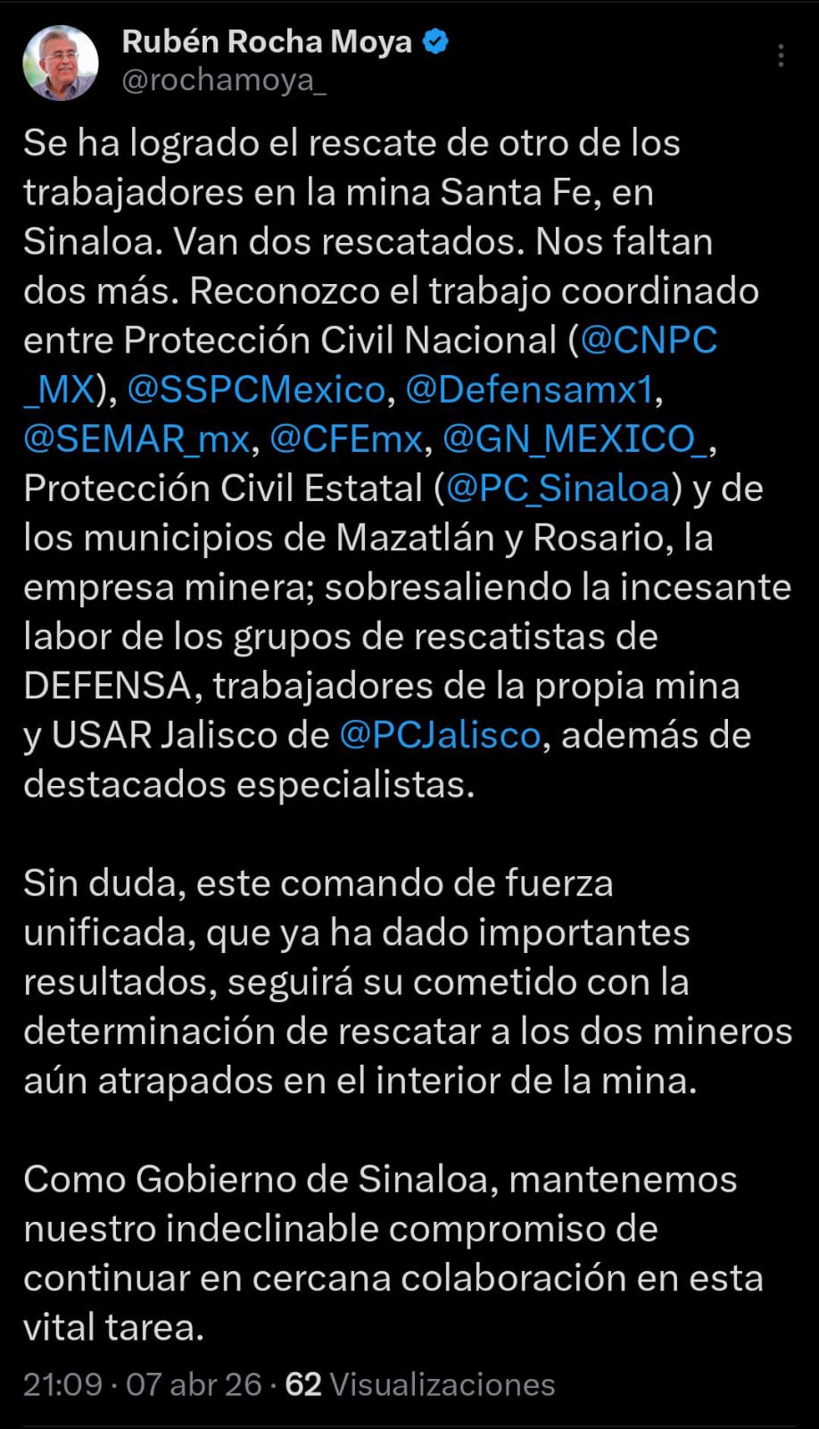 El rescate de Francisco Zapata representa un avance significativo en las labores emprendidas en la mina Santa Fe en El Rosario, y mantiene la esperanza de familiares y autoridades de lograr la extracción segura de otros mineros.