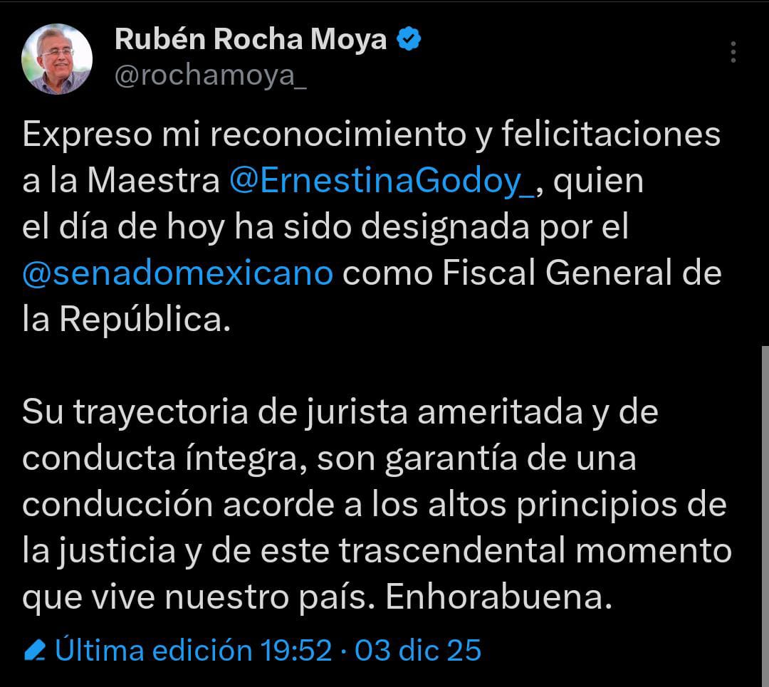 El Gobernador de Sinaloa, Rubén Rocha Moya, expresó este miércoles su reconocimiento y felicitación a la maestra Ernestina Godoy Ramos, luego de que el Senado de la República la designara como la nueva Fiscal General de la República, cargo que desempeñará por un periodo de 9 años.