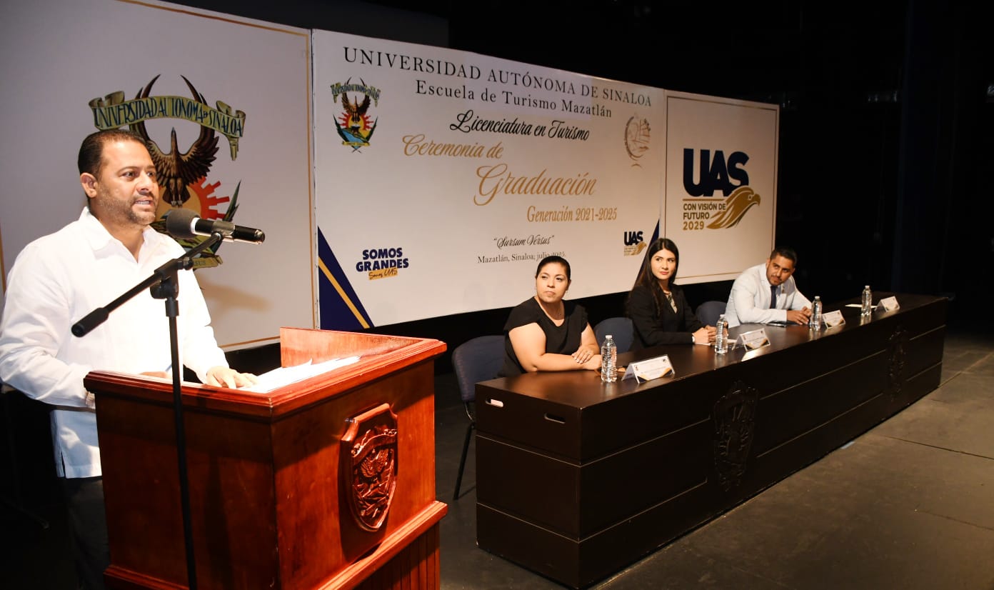 Mazatlán, Sinaloa.– La Escuela de Turismo de la Universidad Autónoma de Sinaloa (UAS), celebró con gran entusiasmo la graduación de 63 estudiantes, acto al que asistió como invitado el Secretario del Ayuntamiento, Moisés Ríos Pérez, en representación de la Presidenta Municipal, Estrella Palacios Domínguez, quien destacó el papel fundamental que juega esta institución en el desarrollo profesional de los jóvenes en el sector turístico.