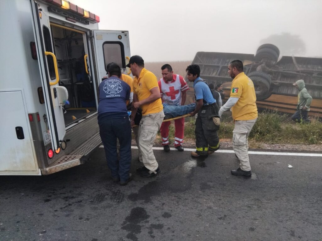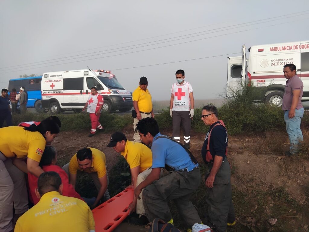 Navolato, Sinaloa | Un aparatoso accidente de un autobús que transportaba a personal jornalero ocurrió en la carretera que conecta a Navolato a El Castillo, en el poblado La Pipima.