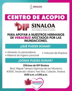 La presidenta de la dependencia, Eneyda Rocha Ruiz, informó que desde el pasado lunes se instaló un centro de acopio en las oficinas del DIF Estatal, en Culiacán, donde la ciudadanía aún puede llevar sus donativos.
