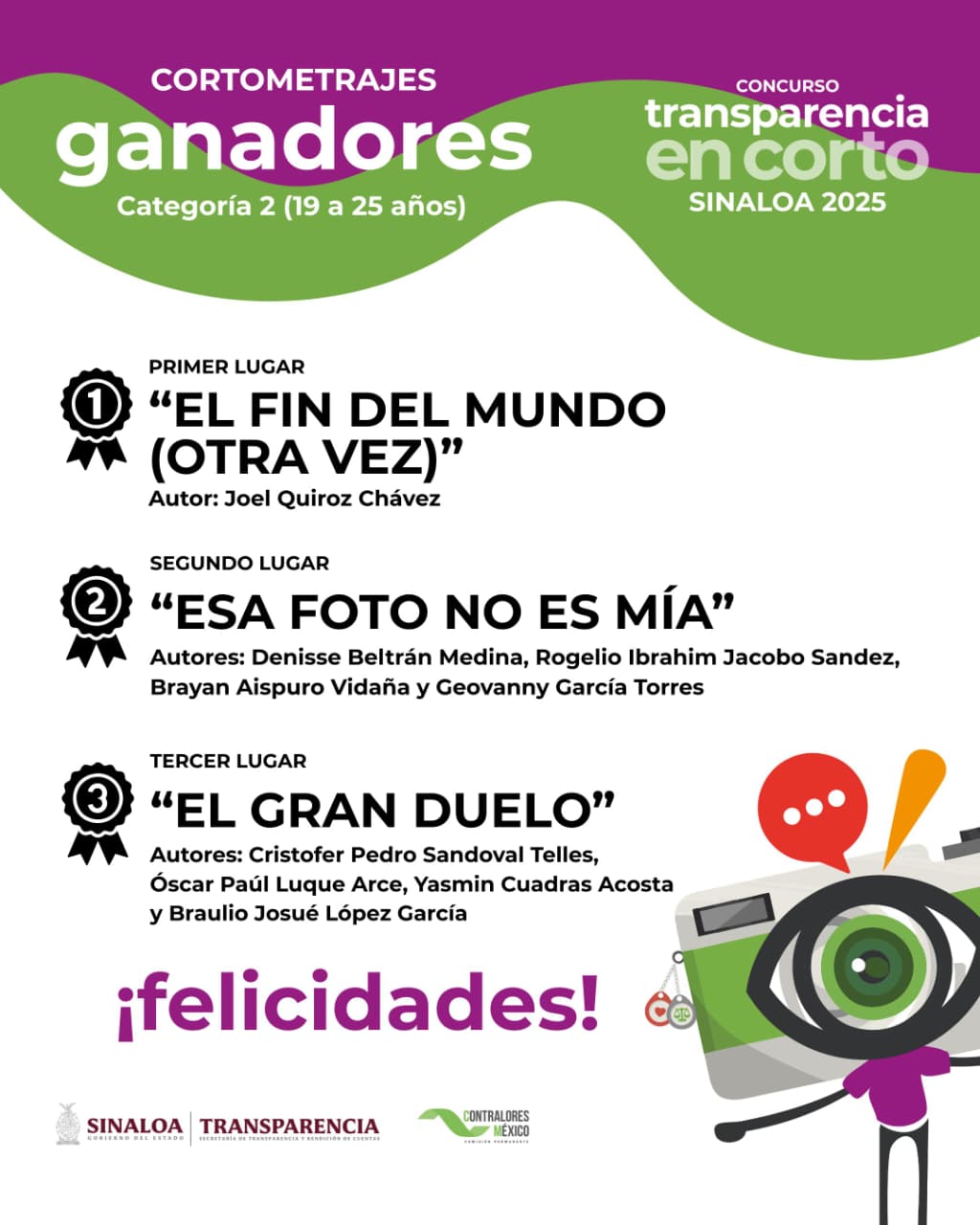 Dichos cortometrajes obtuvieron el primero, segundo y tercer lugar de las categorías 1 y 2 del Concurso Transparencia en Corto Sinaloa 2025, organizado por el Gobierno del Estado de Sinaloa a través de la Secretaría de Transparencia y Rendición de Cuentas, y ahora participan en igualdad de condiciones por el reconocimiento a nivel país.