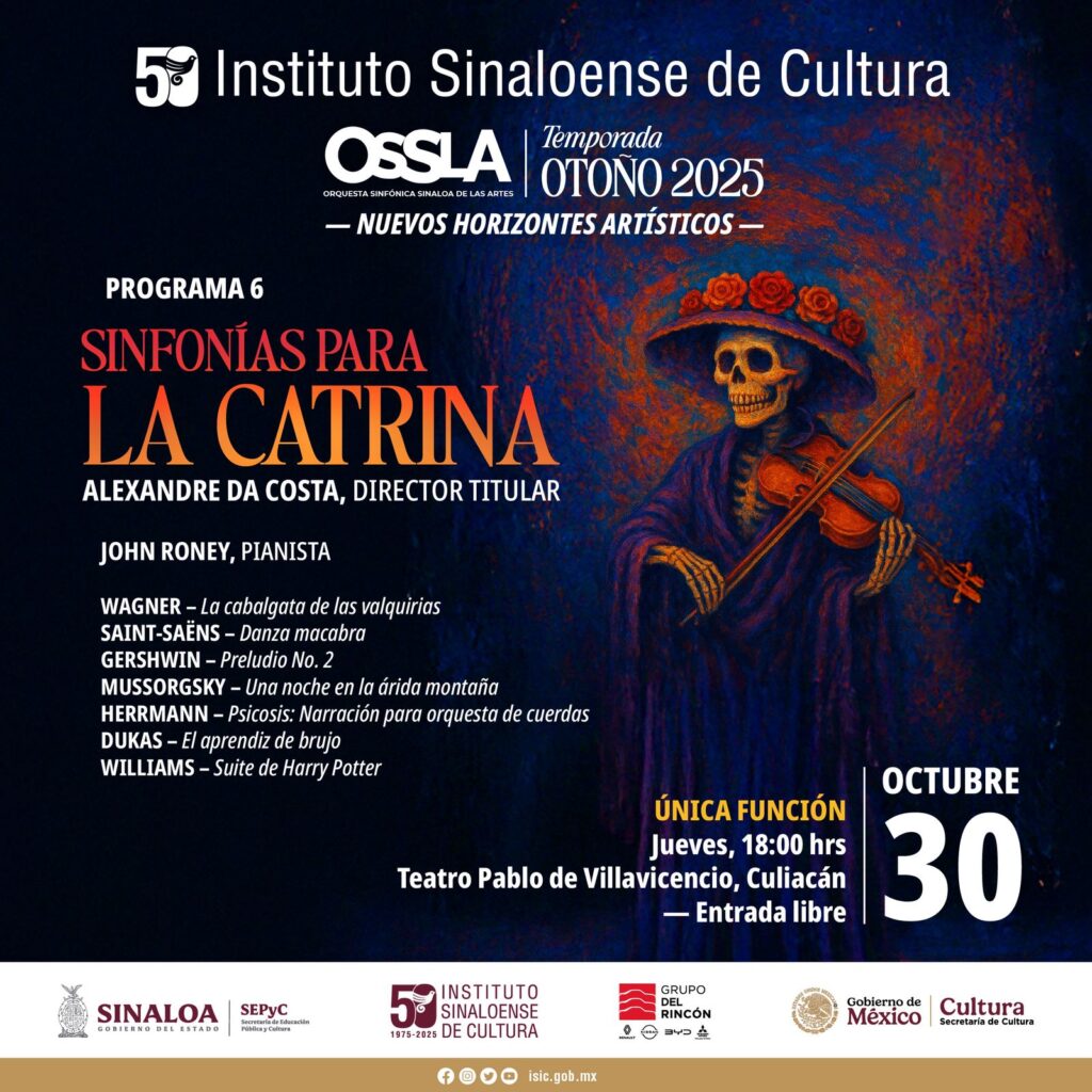 Culiacán, Sin.- Tras concluir una exitosa gira por seis municipios del estado como parte de su brillante participación en el Festival Cultural Sinaloa 2025, la Orquesta Sinfónica Sinaloa de las Artes (OSSLA) se prepara para su próximo programa regular dentro de su Temporada de Otoño 2025, con el concierto titulado Sinfonías para la Catrina, con la participación del Mtro. Alexandre Da Costa, director titular, y como solista, el maestro John Roney al piano.